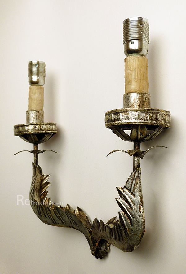 Extraordinaria luminaria antigua, lámpara de pared aplique antiguo en forja plateada en plata vieja años 50, con acabado en pan de plata, muy raro de ver. Diseño orgánico vegetal de 2 brazos, que acaban en forma circular con terminación a modo de vela con cera original. Se ha sustituido el viejo casquillo en mal estado por unos de gran calidad y similar acabado y color al del aplique.
